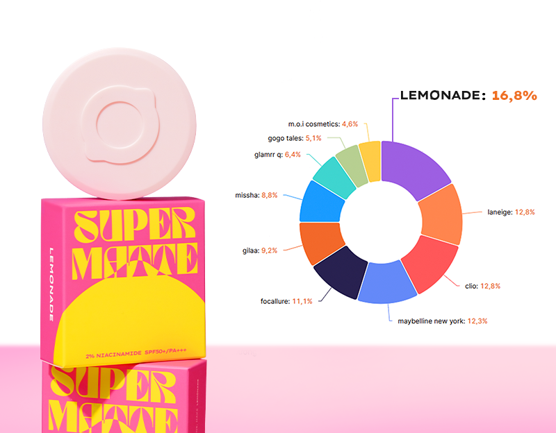 Theo thống kê của Metric trong năm 2023, Supermatte Cushion đang chiếm tới 16,9% thị phần tại Shopee, riêng Tiktokshop lên đến 29.6%. Chính bởi đặc điểm kiềm dầu, bền màu 10 tiếng cùng lớp finish ráo mịn đã giúp Lemonade “ăn điểm” bởi ở Việt Nam có tới 70 – 80 % người sở hữu là da dầu hoặc da hỗn hợp thiên dầu.